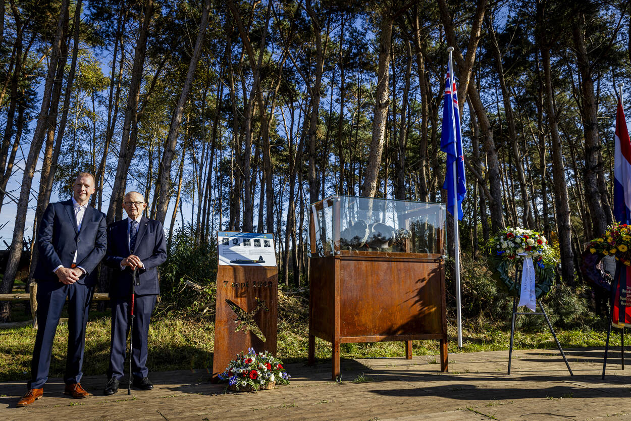 Prof. mr. Pieter van Vollenhoven onthult een monument ter nagedachtenis aan de omgekomen crew van een gecrashte Wellington bommenwerper bij Schijnvliegveld de Kiek. De militair attachées van Duitsland en Nieuw-Zeeland zijn bij de onthulling aanwezig.