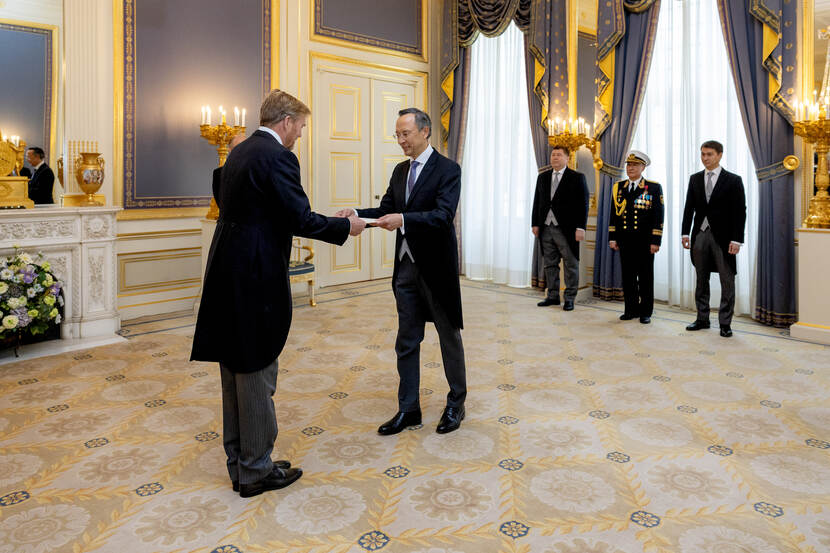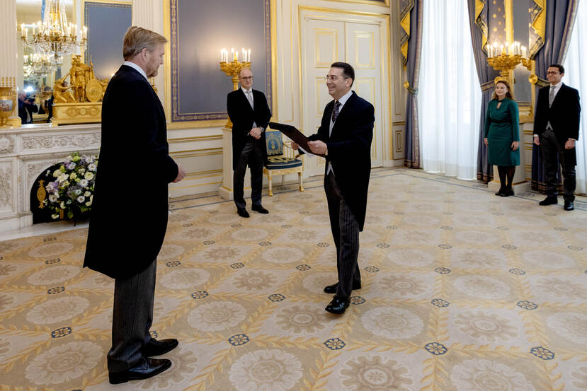 Koning Willem-Alexander ontvangt ter overhandiging van hun geloofsbrieven achtereenvolgens de ambassadeur van de Arabische Republiek Egypte, Zijne Excellentie E.M.H. Kamel, de ambassadeur van de Republiek Kazachstan, Zijne Excellentie K. Abdrakhmanov, en de ambassadeur van de Republiek India, Zijne Excellentie K. Tuhin.