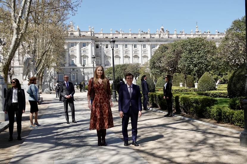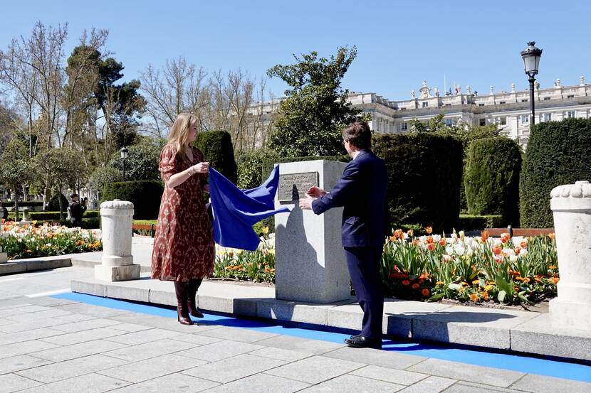 De Prinses van Oranje onthult op de Plaza de Oriente in Madrid een plaquette bij de kleine tulpentuin die zij de Spaanse stad en haar inwoners cadeau gaf. Hiermee wil zij iedereen bedanken die haar verblijf in de stad, gedurende een periode onder bijzondere omstandigheden, mogelijk heeft gemaakt.