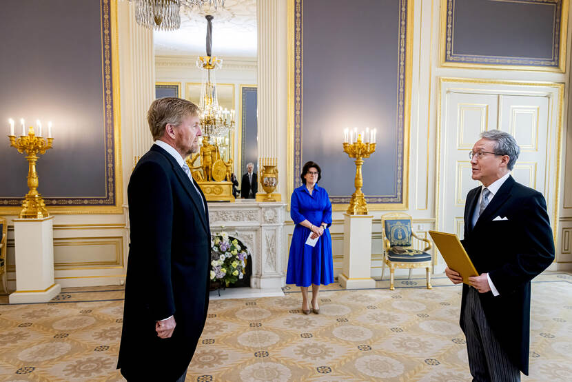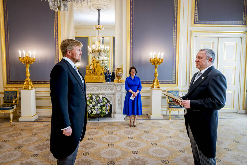Koning Willem-Alexander ontvangt ter overhandiging van hun geloofsbrieven achtereenvolgens de ambassadeur van Korea, Zijne Excellentie S. Hong, en de ambassadeur van Oekraïne, Zijne Excellentie A. Kostin.