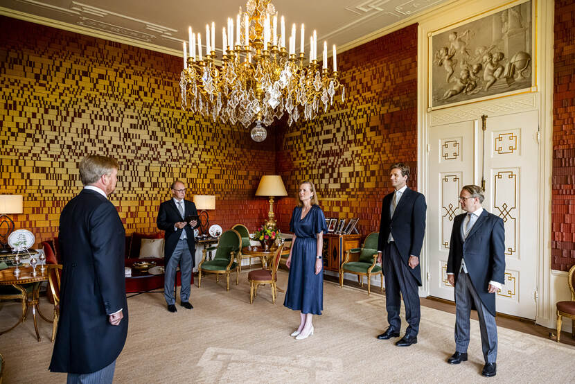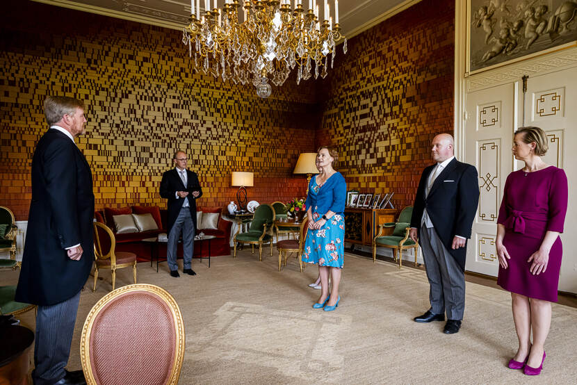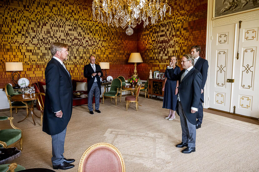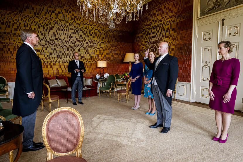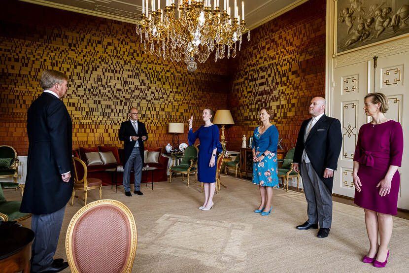 Koning Willem-Alexander ontvangt de heer R. Tieman vanwege zijn benoeming tot minister van Infrastructuur en Waterstaat, de heer V.P.G. Karremans vanwege zijn benoeming tot minister van Economische Zaken, mevrouw D.E.M.C. Jansen vanwege haar benoeming tot minister van Volksgezondheid, Welzijn en Sport, mevrouw H. Boerma vanwege haar benoeming tot staatssecretaris van Buitenlandse Zaken, de heer A.A. Aartsen vanwege zijn benoeming tot staatssecretaris van Infrastructuur en Waterstaat, mevrouw J.Z.C.M. Tielen vanwege haar benoeming tot staatssecretaris van Volksgezondheid, Welzijn en Sport en mevrouw N.J.F. Pouw-Verweij vanwege haar benoeming tot staatssecretaris van Volksgezondheid, Welzijn en Sport. De ministers en staatssecretarissen worden ten overstaan van de Koning beëdigd.