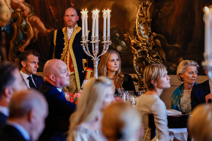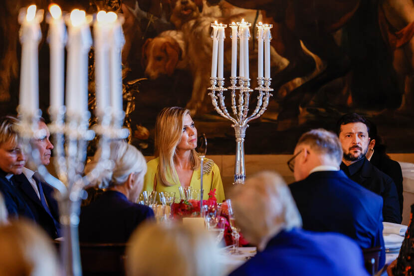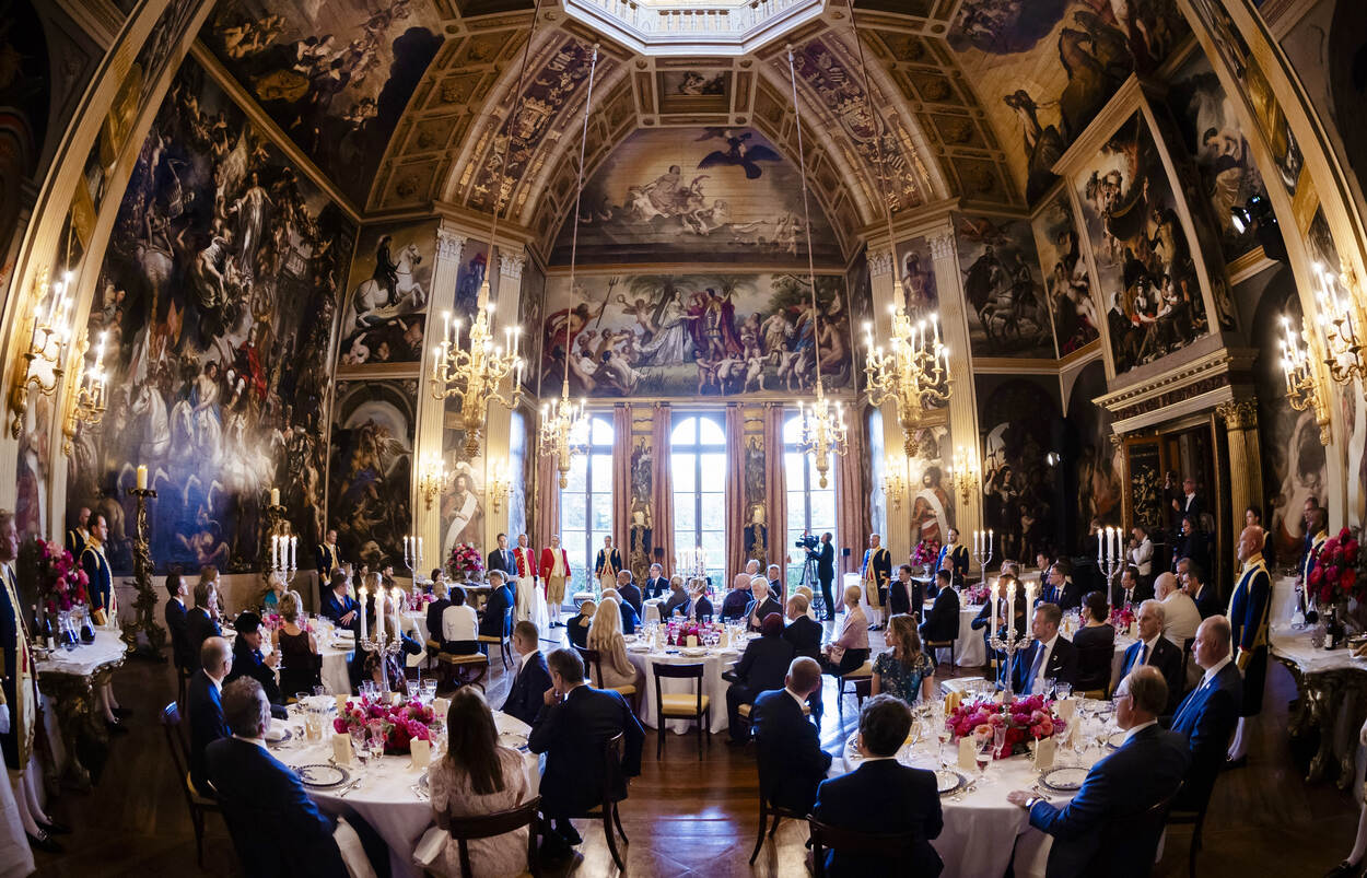 Koning Willem-Alexander en Koningin Máxima ontvangen en marge van de NAVO-top in Den Haag de deelnemende staatshoofden en regeringsleiders voor een diner. De Prinses van Oranje is ook aanwezig.