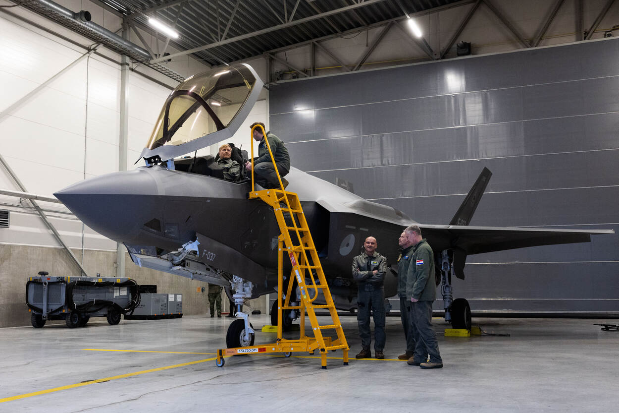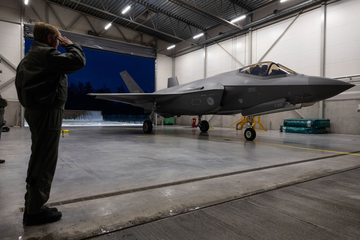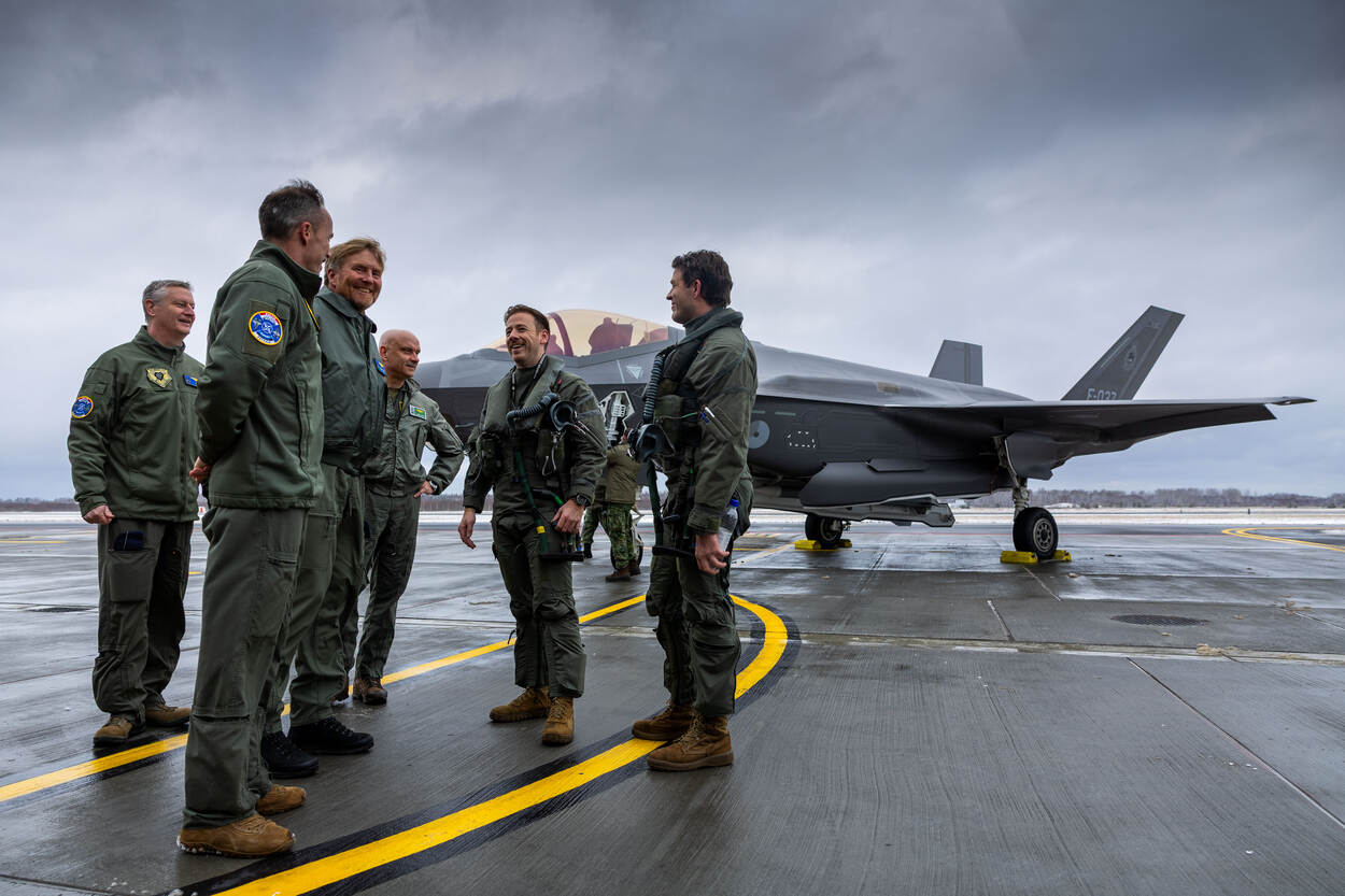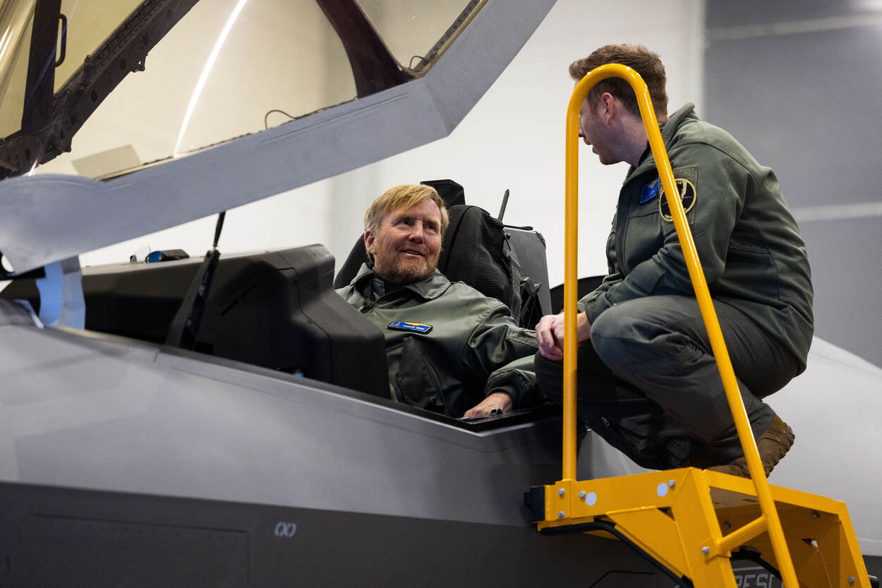 De Koning krijgt uitleg over de F-35-gevechtsvliegtuigen waarmee het NAVO-luchtruim aan de oostgrens van het NAVO-verdragsgebied wordt bewaakt.