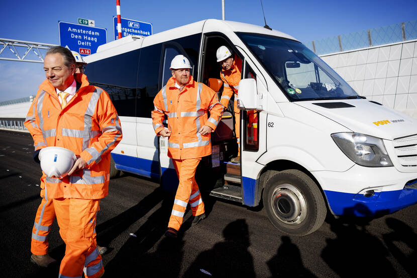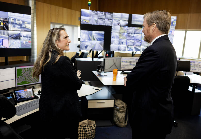 Koning Willem-Alexander brengt samen met minister van Infrastructuur en Waterstaat, Barry Madlener, een werkbezoek aan de regionale verkeerscentrale in Rhoon, het vernieuwde A16 tracé Rotterdam met de Rottemerentunnel en het nabijgelegen viaduct in de A16 bij het Terbregseplein.