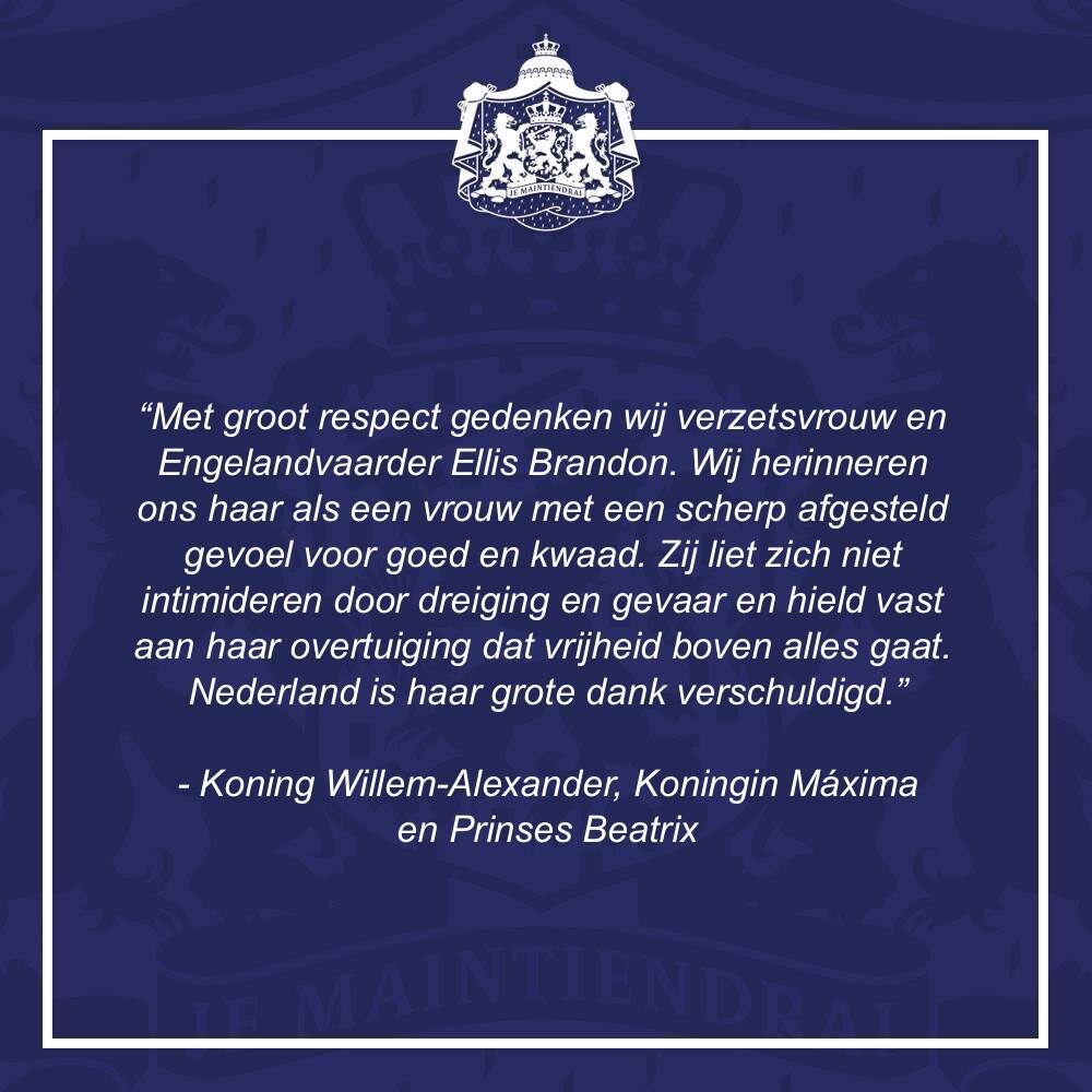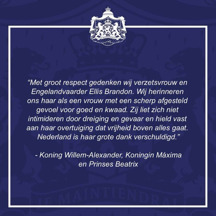 “Met groot respect gedenken wij verzetsvrouw en Engelandvaarder Ellis Brandon. Wij herinneren ons haar als een vrouw met een scherp afgesteld gevoel voor goed en kwaad. Zij liet zich niet intimideren door dreiging en gevaar en hield vast aan haar overtuiging dat vrijheid boven alles gaat. Nederland is haar grote dank verschuldigd.”