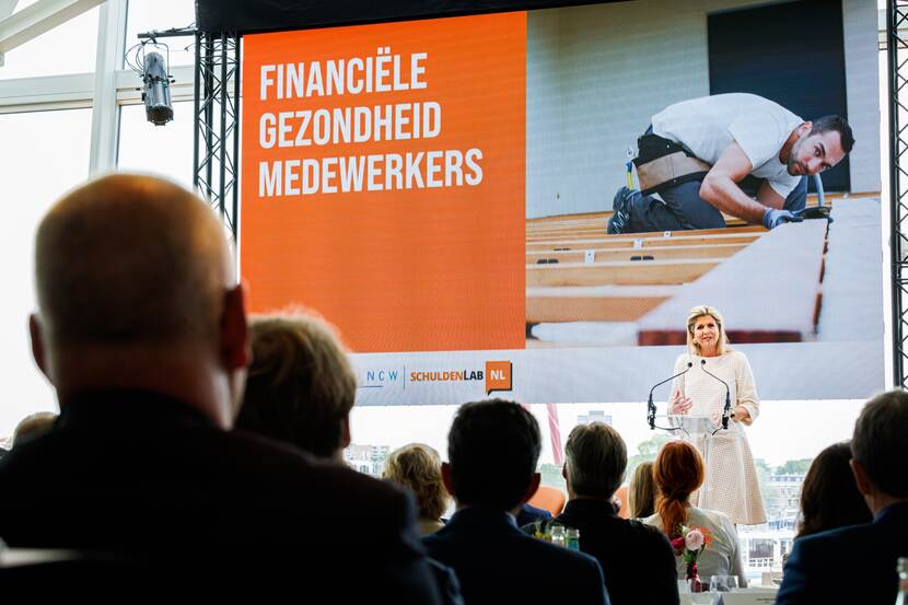 Koningin Máxima neemt deel aan een conferentie over het belang van financiële gezondheid van werknemers in het bedrijfsleven.