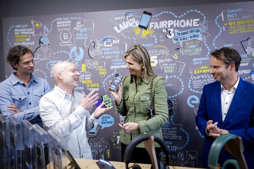 Koningin Máxima bezoekt Fairphone, prijswinnaar van de Koning Willem I prijs 2024 in de categorie Duurzaam Ondernemerschap.