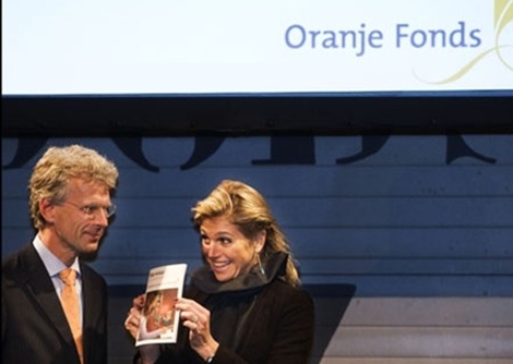Utrecht, 8 november 2008: Prinses Máxima krijgt het boekje 'Elkaar Verstaan' uitgereikt. Drie jaar Taalontmoetingen 2005 - 2008’ van Ronald van der Giessen. De Prinses sprak in Utrecht tijdens het slot van het driejarige programma Taalontmoetingen van het Oranje Fonds.