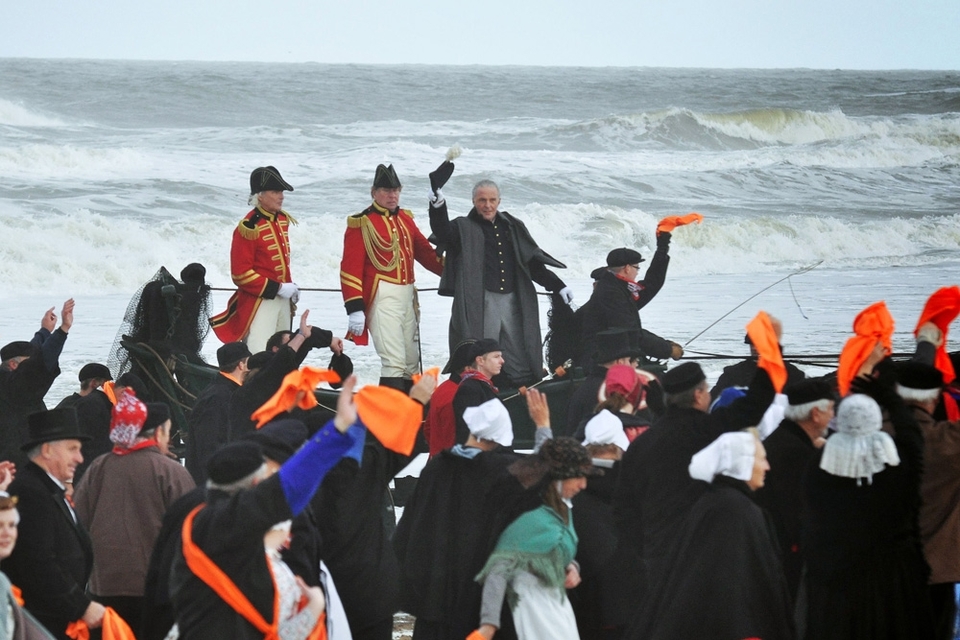 Zaterdagochtend bezoeken Zijne Majesteit Koning Willem-Alexander en Hare Majesteit Koningin Máxima de nagespeelde historische landing van Prins Willem Frederik in 1813 op Scheveningen.