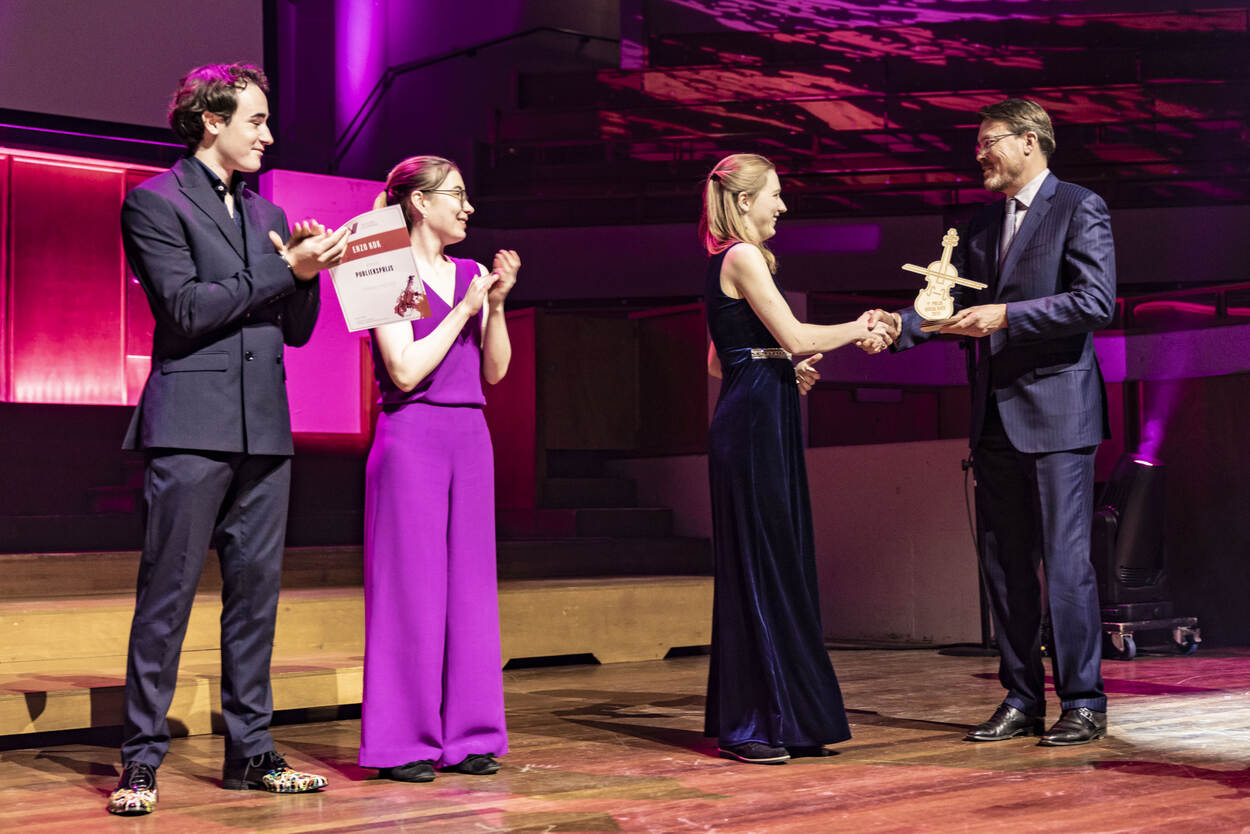 Prins Constantijn reikt de prijzen uit na de finale van het Nederlands Vioolconcours. De Prins is beschermheer van het Nederlands Vioolconcours. Het evenement wordt om de twee jaar gehouden.