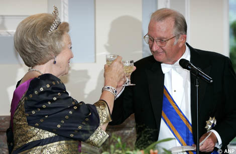In België herdenkt men dit jaar niet alleen het 175 jarig bestaan van Uw land, maar ook het feit dat hier 25 jaar geleden een proces van federalisering is begonnen. Reeds vijf rondes van staatshervormingen hebben plaatsgevonden en de volgende staat op de agenda voor volgend jaar. Zo zoekt België naar nieuwe staatkundige structuren die beantwoorden aan de verlangens van zijn bevolking en passen bij de werkelijkheid van vandaag. Dit voortgaande proces stelt ook hoge eisen aan het staatshoofd. Gaarne en van harte wil ik U complimenteren met de voorbeeldige wijze waarop U Uw moeilijke taak vervult en de eenheid van België vertegenwoordigt.