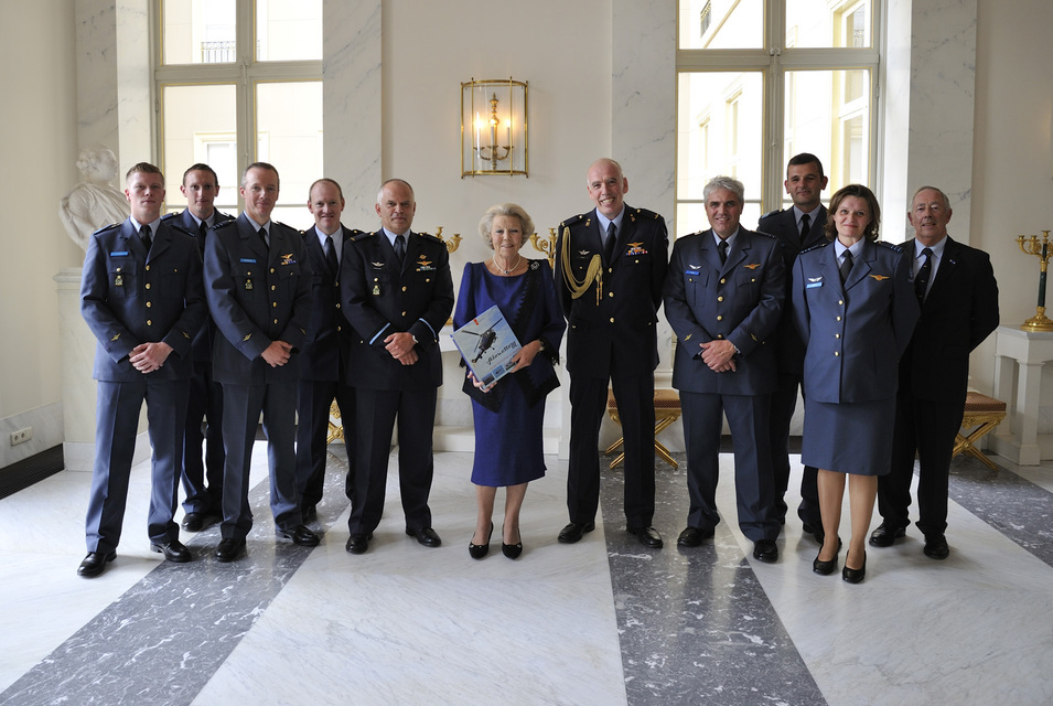 Hare Koninklijke Hoogheid Prinses Beatrix der Nederlanden heeft vanmiddag, woensdag 10 september 2014, op Paleis Noordeinde een fotoboek in ontvangst genomen van de Koninklijke Luchtmacht over 50 jaar Alouette helikopter.