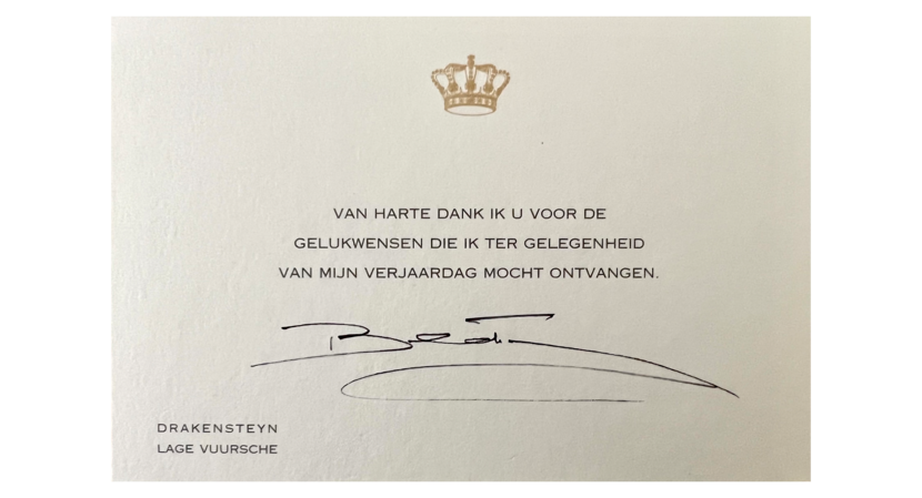 Bedankkaart van Prinses Beatrix ter gelegenheid van de gelukwensen voor haar 85ste verjaardag.