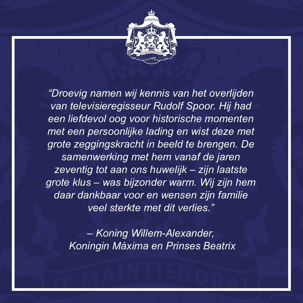 “Droevig namen wij kennis van het overlijden van televisieregisseur Rudolf Spoor. Hij had een liefdevol oog voor historische momenten met een persoonlijke lading en wist deze met grote zeggingskracht in beeld te brengen. De samenwerking met hem vanaf de jaren zeventig tot aan ons huwelijk – zijn laatste grote klus – was bijzonder warm. Wij zijn hem daar dankbaar voor en wensen zijn familie veel sterkte met dit verlies.”