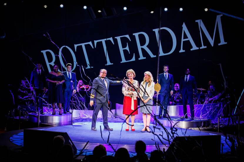Prinses Margriet doopt cruiseschip MS Rotterdam VII, dat voor de doop ligt afgemeerd bij de cruiseterminal. Het schip maakt deel uit van de Holland America Line.