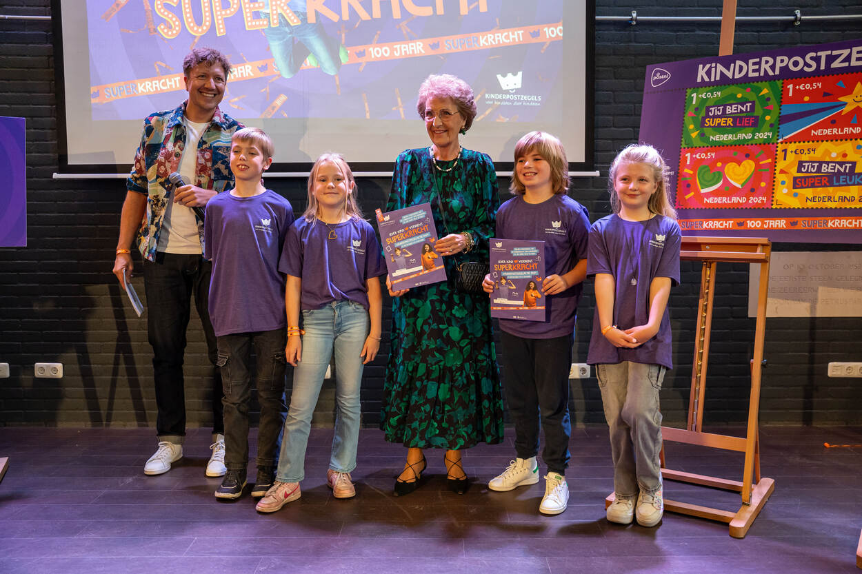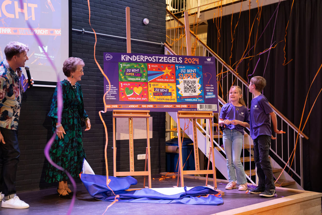 Tijdens de viering van het 100-jarig bestaan van Kinderpostzegels onthult Prinses Margriet samen met kinderen de jubileumzegel en bestelt ze de eerste postzegels uit de nieuwe serie.