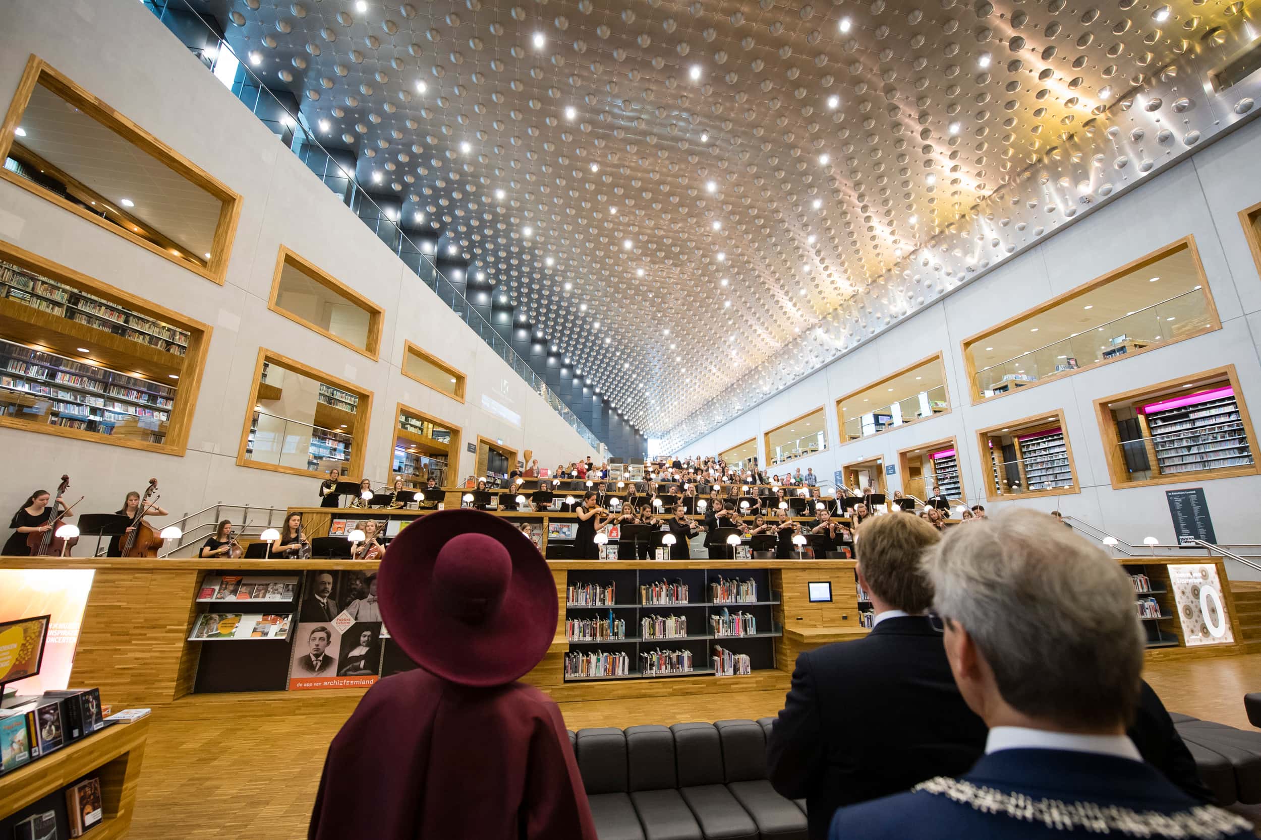 Na een optreden van het Amersfoorts Jeugd Orkest en leerlingen van Scholen in de Kunst spraken de Koning en Koningin met oude en nieuwe inwoners van Amersfoort over de invloed van het snel groeiende inwoneraantal op de identiteit van de stad. Centraal in het gesprek stond hoe de groter wordende stad voorzieningen voor alle inwoners kan bieden, samenhang kan creëren en toch zijn eigenheid kan behouden.