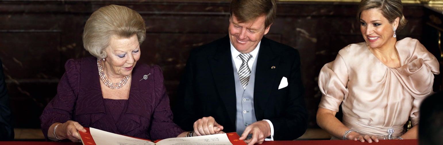 Op 30 april, kort na tien uur ’s ochtends, ondertekende Koningin Beatrix de Akte van Abdicatie in de Mozeszaal in het Koninklijk Paleis Amsterdam. Precies drieëndertig jaar was zij Koningin. Met de ondertekening verklaarde zij afstand te doen van het Koningschap van het Koninkrijk der Nederlanden. Koning Willem-Alexander en Koningin Máxima ondertekenden de Akte als getuigen, evenals onder anderen de voorzitters van de beide Kamers van de Staten-Generaal. Na de abdicatie stelde Prinses Beatrix vanaf het balkon van het Paleis de nieuwe Koning voor aan de duizenden toegestroomde mensen op de Dam en, via de televisiecamera’s, aan alle inwoners van het Koninkrijk. Vervolgens werd het Wilhelmus gezongen. Daarna kwamen de drie Prinsessen Catharina-Amalia, Alexia en Ariane naar buiten.