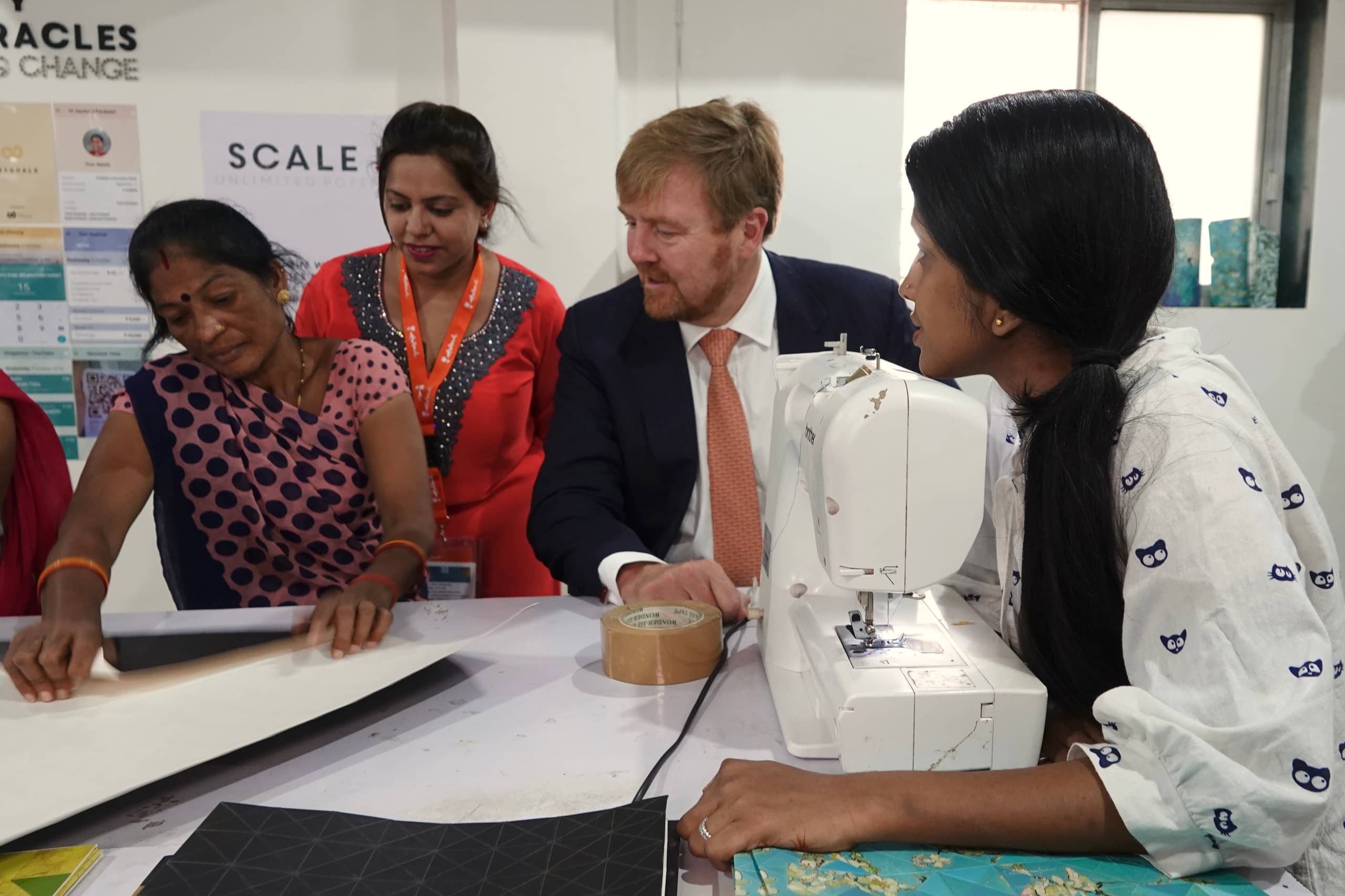 Koning Willem-Alexander krijgt een rondleiding door een werkplaats waar producten van Nederlandse ontwerpers worden gemaakt door Indiase vrouwen.