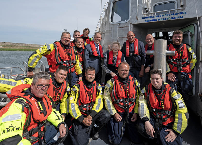 Prinses Beatrix en vrijwilligers van de KNRM.