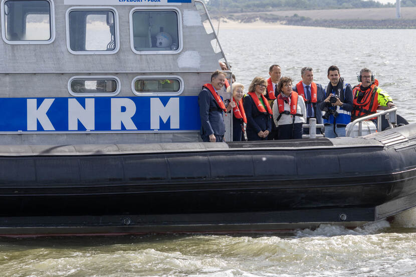 Prinses Beatrix vaart mee op een reddingboot van de KNRM en bekijkt een Search and Rescue-oefening.