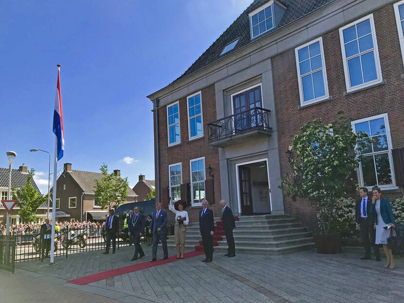 Koning Willem-Alexander en Koningin Máxima startten het streekbezoek in Opheusden, gemeente Neder-Betuwe, waar zij bij het gemeentehuis welkom werden geheten door de commissaris van de Koning, de heer J.C.G.M. Berends.
