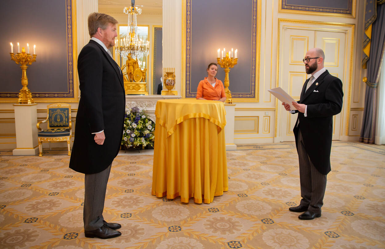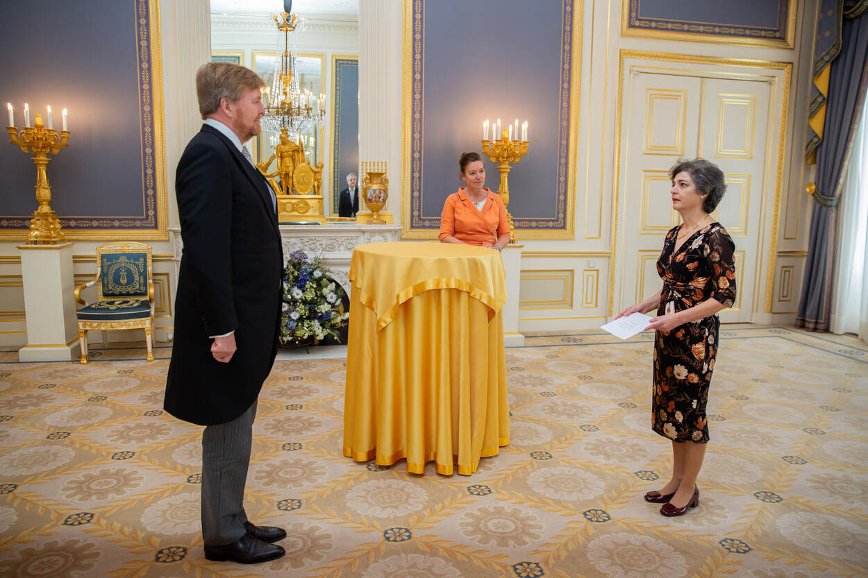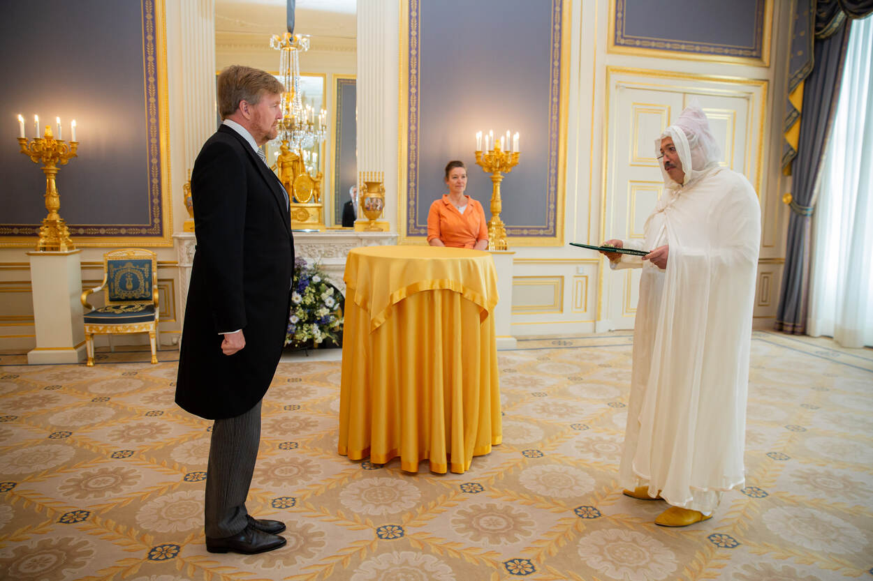 Koning Willem-Alexander ontvangt ter overhandiging van hun geloofsbrieven achtereenvolgens de ambassadeur van Oekraïne, Z.E. Maksym Kononenko, de ambassadeur van het Koninkrijk Marokko, Z.E. Mohamed Basri, en de ambassadeur van het Koninkrijk Spanje, H.E. mevrouw María Consuelo Femenía Guardiola.
