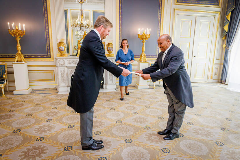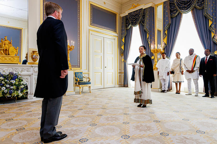Koning Willem-Alexander ontvangt ter overhandiging van hun geloofsbrieven achtereenvolgens de ambassadeur van de Republiek Djibouti, Z.E. Aden Mohamed Dileita, en de ambassadeur van de Federale Democratische Republiek Ethiopië, H.E. Hirut Zemene Kassa.