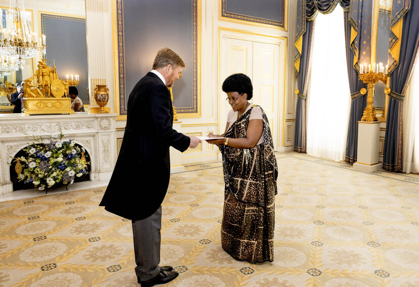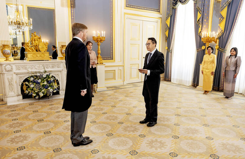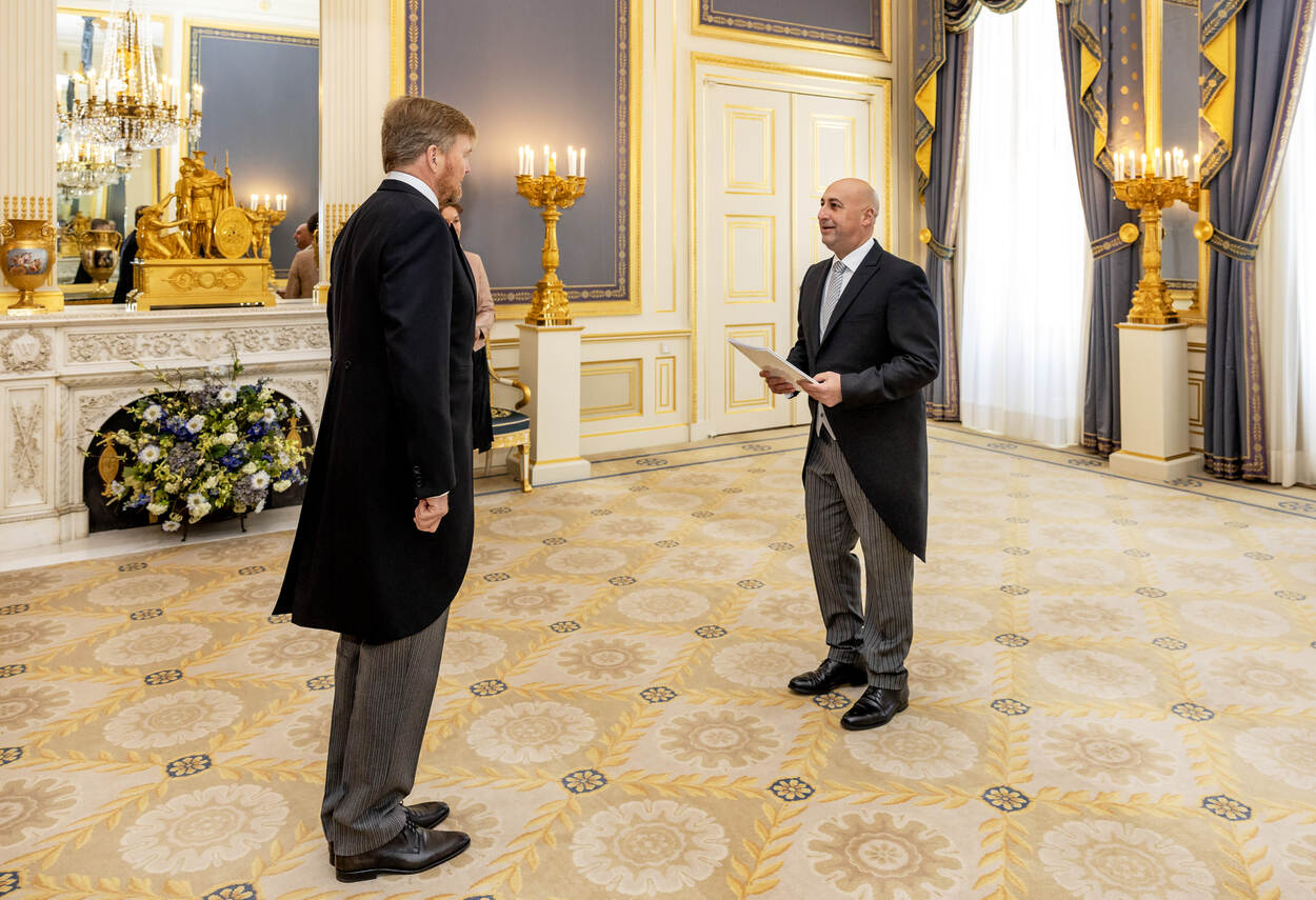 Koning Willem-Alexander ontvangt ter overhandiging van hun geloofsbrieven achtereenvolgens de ambassadeur van de Republiek Burundi, Hare Excellentie I. Ndahayo, de ambassadeur van het Koninkrijk Thailand, Zijne Excellentie A. Mamanee, en de ambassadeur van de Republiek Malta, Zijne Excellentie J. Curmi.