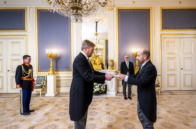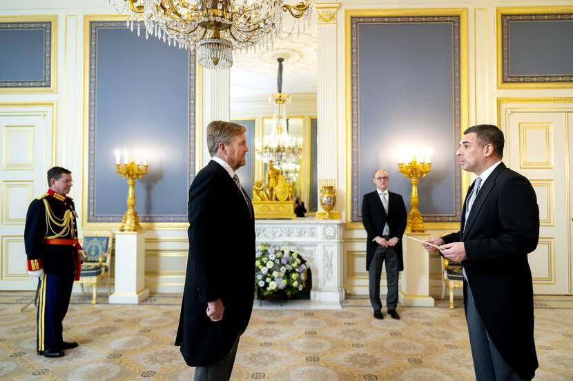 Koning Willem-Alexander ontvangt ter overhandiging van hun geloofsbrieven achtereenvolgens de ambassadeur van Roemenië, Zijne Excellentie N. Comănescu, en de ambassadeur van San Marino, Zijne Excellentie E. Gasperoni.