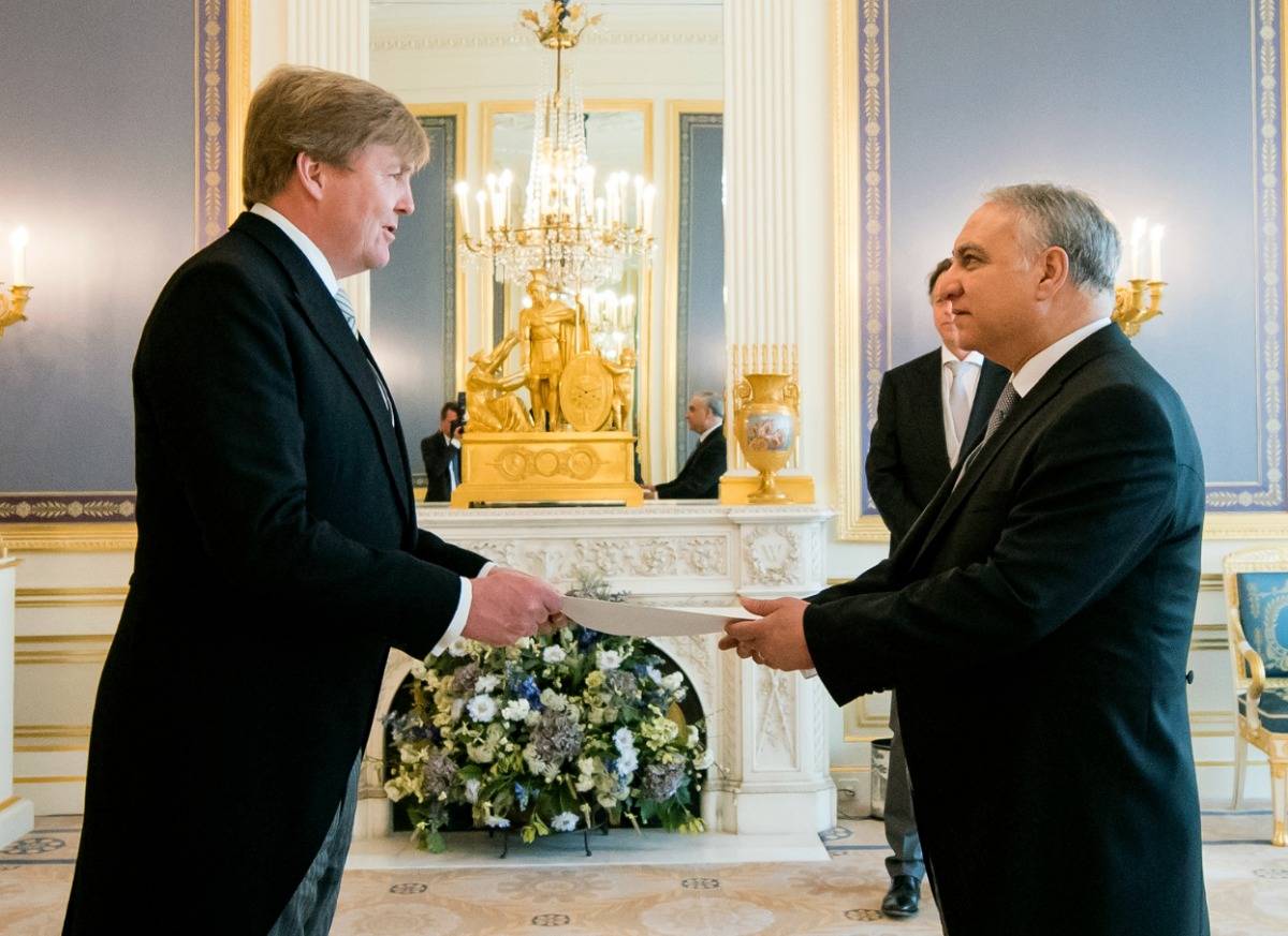 Den Haag, 30 maart 2016: Koning Willem-Alexander ontvangt op Paleis Noordeinde de geloofsbrieven van de ambassadeur van de Republiek Kirgizië, Z.E. Asein Kuseinovich Isaev.