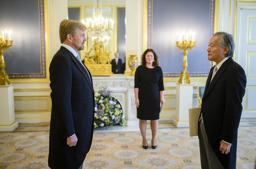 De Koning ontvangt de geloofsbrieven van de ambassadeur van Japan, Z.E. Hidehisa Horinouchi.