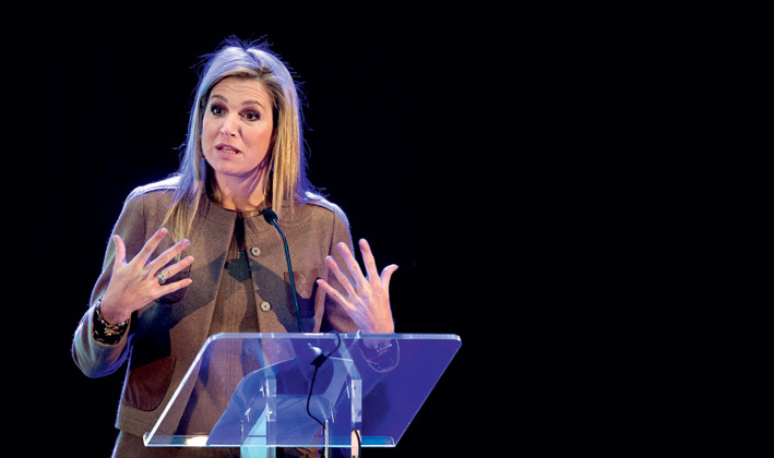 Prinses Máxima sprak in haar hoedanigheid van speciaal pleitbezorger van de Secretaris- Generaal van de Verenigde Naties op het gebied van financiering voor ontwikkeling. Vanuit deze functie zet zij zich wereldwijd in om financiële diensten, zoals een bank-of spaarrekening, verzekering of lening, voor iedereen toegankelijk te maken. “Ondernemers uit Latijns-Amerika, Afrika en Azië vertellen me telkens weer hoe moeilijk het is om financiering te krijgen”, aldus de Prinses. “Als we ons realiseren dat juist kleine en middelgrote bedrijven de aanjagers zijn van nieuwe werkgelegenheid en economische groei, dan is duidelijk dat er iets moet gebeuren. Het is goed nieuws dat overheden en diverse partners op veel plekken hard aan de slag zijn om de financiële infrastructuur te versterken en een klimaat te scheppen dat gunstig is voor economische ontwikkeling.”