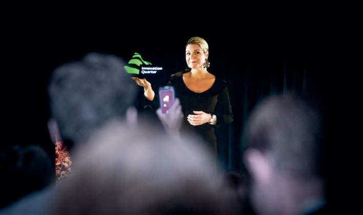 “Op dit moment ben ik in Tanzania. Tóch kan ik vandaag bij u zijn, dankzij de moderne techniek.” Via een hologram lanceerde Koningin Máxima op 12 december de regionale ontwikkelingsmaatschappij voor Zuid-Holland: InnovationQuarter. Het doel van InnovationQuarter is de versterking van de concurrentiekracht van Zuid-Holland door innovatieve bedrijven te ondersteunen en te financieren. De presentatie vond plaats in Delft. De Koningin stak ondernemend Zuid-Holland virtueel een hart onder de riem: “Deze regio heeft heel veel in huis. Ambitieuze ondernemers. Sterke universiteiten. Creatieve mensen met goede ideeën. Dankzij de nieuwe regionale ontwikkelingsmaatschappij kan het geweldige potentieel nog beter worden benut.”