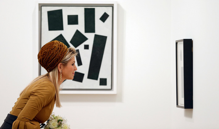 Hare Majesteit Koningin Máxima opende 18 oktober in het Stedelijk Museum in Amsterdam de tentoonstelling ‘Kazimir Malevich en de Russische avant-garde’. Kazimir Malevich (1878- 1935) is een van de grondleggers van de abstracte kunst. Het Stedelijk Museum heeft een sterke band met het werk van de Russische kunstenaar; het beheert de grootste verzameling werken van Malevich buiten Rusland. In 1923 organiseerde het Stedelijk de eerste grote tentoonstelling buiten Rusland van Russische negentiende en twintigste-eeuwse kunst, inclusief het werk van Malevich.