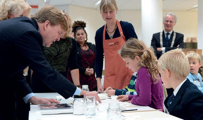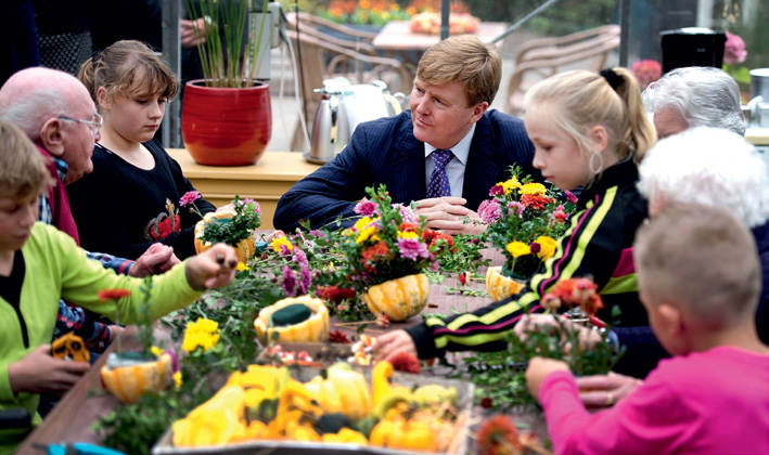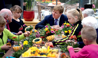 Zijne Majesteit Koning Willem-Alexander bezocht 8 oktober het initiatief Gluren bij de Buren in Oosterwolde (Fryslân). Gluren bij de Buren ontstond drie jaar geleden door een samenwerking tussen verpleeghuis Stellinghaven en de tegenover liggende basisschool Tussen De Singels. De bewoners van het verpleeghuis en de kinderen van de basisschool ontmoeten elkaar dagelijks. Ze doen samen leuke dingen in het verpleeghuis, op de basisschool en in de naastgelegen moestuin en kas. Zo bakken ze samen pannenkoeken, knutselen ze en doen ze samen spelletjes. Voorleesoma’s en –opa’s laten de kinderen genieten van mooie verhalen. De Koning at een pannenkoek mee en praatte met ouderen en kinderen over hun ervaringen. “De kinderen beleven er ontzettend veel plezier aan”, zei Fancy Hoekstra, directeur van de basisschool. Ook activiteitenbegeleidster Feikje van der Lei was enthousiast: “Kinderen brengen vreugde in het huis. Ik zeg altijd: jongens haal alle generaties bij elkaar en je hebt geweldige activiteiten. Het kost weinig, dus ga het gewoon doen!”