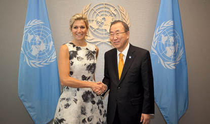Hare Majesteit Koningin Máxima overhandigde op 23 september in New York het vierde jaarverslag over inclusieve financiering voor ontwikkeling aan de Secretaris-Generaal van de VN, Ban Ki-moon. De Koningin is Speciaal Pleitbezorger van de Secretaris-Generaal voor inclusieve financiering voor ontwikkeling.