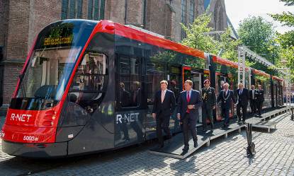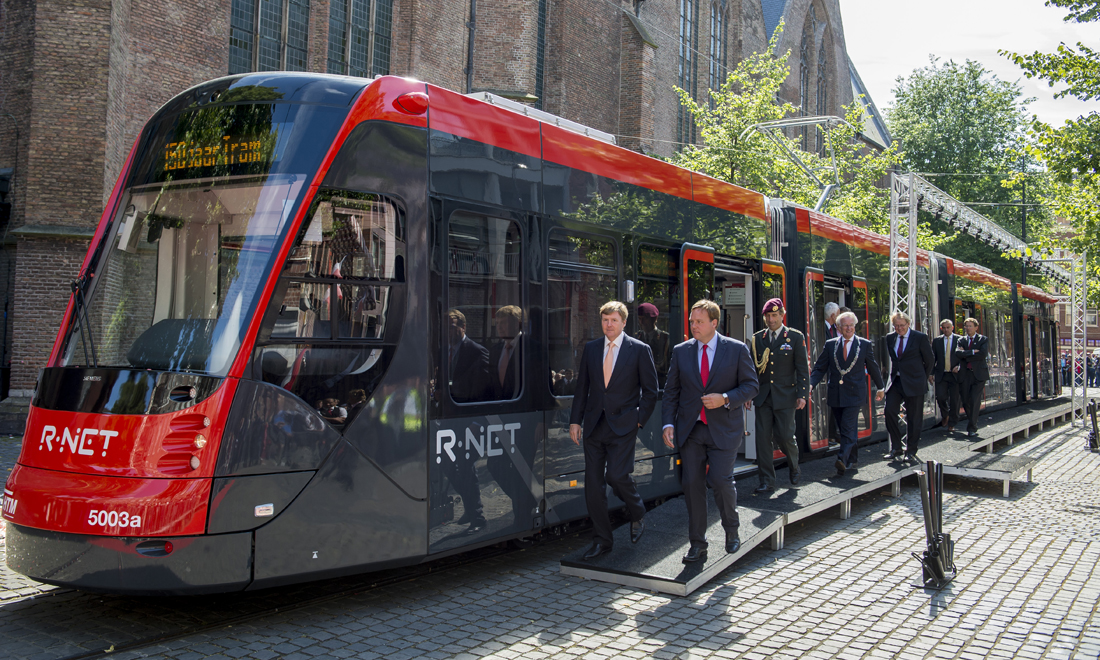 Na de nostalgische herinneringen was het tijd voor een blik op de toekomst. Bij de Grote Kerk werd de nieuwste stadstram van HTM aan het publiek en de Koning gepresenteerd. In de Grote Kerk sprak de Koning met trambestuurders, controleurs en andere medewerkers van HTM over hun persoonlijke ervaringen in het openbaar vervoer en de problemen die zij tegenkomen, vooral op het gebied van sociale veiligheid.