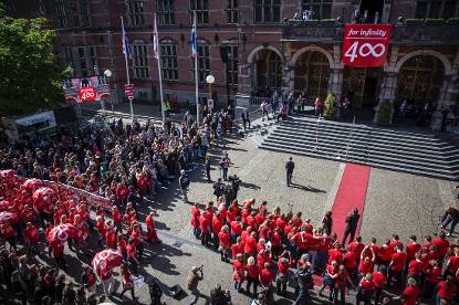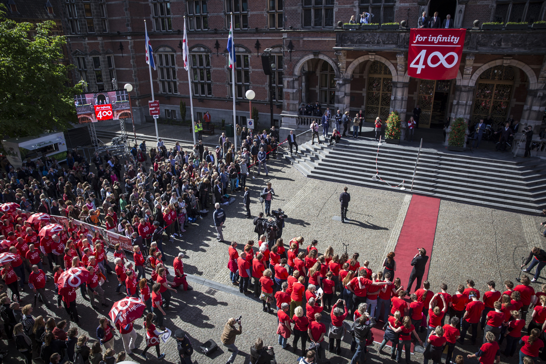 Ter gelegenheid van het lustrum brachten 250 studenten en koorleden uit stad en ommeland de Koning een serenade. Staande op het balkon van het Academiegebouw werd hij verrast door een ‘flashmob’ op het plein die zich ontpopte tot gelegenheidskoor. In 1871 verwelkomde de universiteit van Groningen de eerste vrouwelijke student in Nederland: Aletta Jacobs. Vandaag de dag studeren er 29.000 studenten, van wie iets meer dan de helft vrouw.