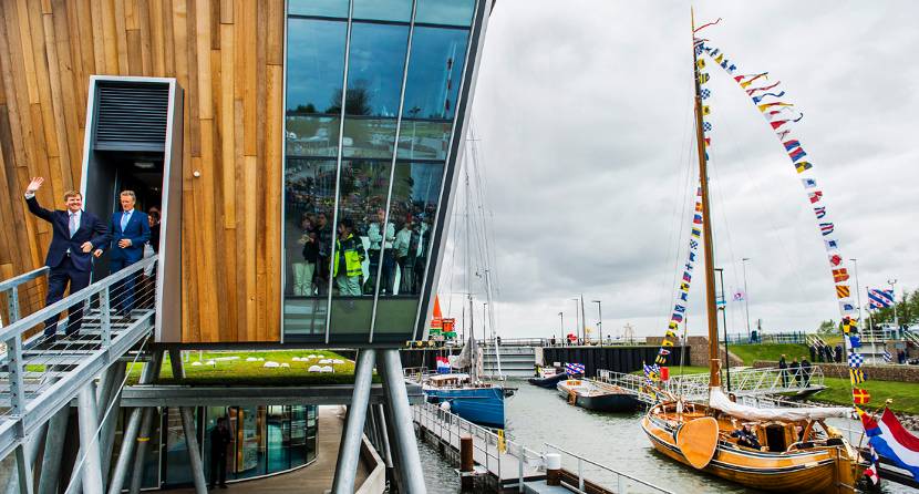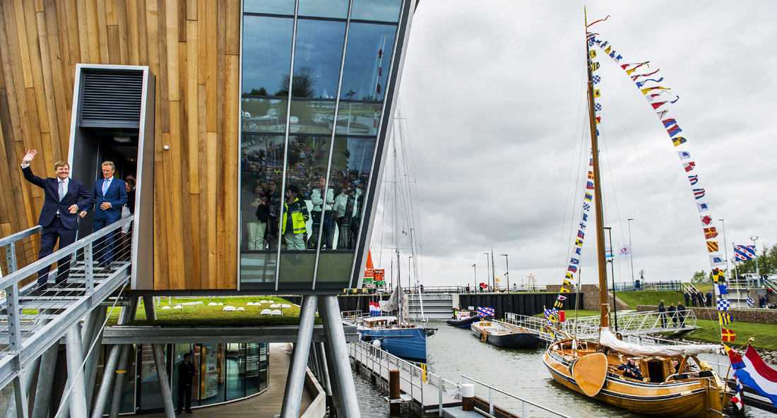 Aan boord van de Bestevaer 56ST ‘HannaH’ kreeg de Koning een symbolische sleutel aangereikt. Hij maakte deze vast aan de voorschootval en hees hem omhoog. Vervolgens openden de sluisdeuren zich, waarna ‘HannaH’, de sluis binnenvoer. Hiermee was deze officieel geopend. Circa driehonderd mensen uit Stavoren en omgeving deden mee aan het theaterstuk dat de opening omlijstte. De nieuwe sluis is milieuvriendelijk en oogt als een natuurlijke aanlegplaats. Dankzij een grote knik in de sluiskolk biedt deze veel ruimte waardoor het voor de recreatievaart eenvoudig manoeuvreren is. Op de plek waar de sluiskolk overgaat in het Johan Frisokanaal ligt een tweede brug. Bij het sluiten daarvan wordt energie teruggewonnen die vervolgens weer gebruikt wordt bij het openen van de brug.