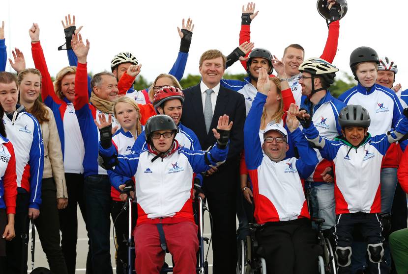 Zijne Majesteit Koning Willem-Alexander ging op 8 mei een kijkje nemen in Almere. Hij sprak met vertegenwoordigers van de betrokken organisaties, vrijwilligers en deelnemers. Michel van Mullum (die in een rolstoel zit) komt erg graag bij ASV. “Ik vind het leuk om als een speer over het ijs te gaan. Ik haal dan de voetplankjes van mijn rolstoel af en bind easygliders onder mijn schoenen. Een vrijwilliger schaatst achter mijn rolstoel. Dat geeft mij het gevoel dat ik schaats. Het geeft mij de kracht om door te gaan en niet op te geven.” Marlies Grolle is maatje van de autistische Barbara Groen “Ik was eerst Barbara’s begeleider tijdens de G-schaatslessen. Barbara heeft zich zo ontwikkeld dat ze nu in de reguliere lessen meeschaatst. Nu ondernemen we leuke dingen en gaan we bijvoorbeeld samen de stad in.” De samenwerkende partners binnen Super COOL! nemen deel aan het Oranje Fonds programma Kracht van Sport. Hiermee ondersteunt het Fonds coalities van lokale partijen bij het inzetten van sport als sociaal bindmiddel.