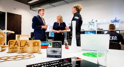 tussen beroepsonderwijs en arbeidsmarkt.In Neede ontmoetten de Koning en Koningin een aantal inwoners in de ‘huiskamerruimte’ van Grandcafé De Hofmaat. Het dorp heeft te maken met een teruglopend inwonersaantal en vergrijzing. De inwoners zetten zich op tal van manieren in om het dorp aantrekkelijk te houden voor jong en oud. Een van de initiatieven is Achterhoek Connect, een digitale ontmoetingsplaats waar mensen contacten kunnen leggen en terecht kunnen met vragen over welzijn, wonen en zorg. Gebruiker de heer Leussink (89) vertelde over zijn ervaringen met deze nieuwe manier van ‘beeldzorg’. Hij kan op elk gewenst moment met de wijkverpleegkundige beeldbellen en buiten werktijd contact leggen met de verpleegkundigen van het medisch service center van Sensire. Wijkverpleegkundige Marjo van Hout vertelde de Koningin dat veel klanten zich sinds zij de iPad gebruiken veiliger en minder eenzaam voelen.