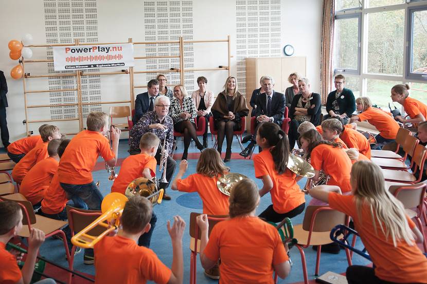 Power Play is een programma van muziekgezelschap Triton uit Winsum en muziekvereniging Euphonia uit Warffum. Zij geven muzieklessen op (basis)scholen en proberen het zelfvertrouwen van de kinderen te vergroten door hen muziek te leren maken uit het hoofd. Zo kunnen ook dyslectische kinderen goed meedoen. De Koningin praatte met initiatiefnemers, docenten en vrijwilligers en was bij een les en een optreden.