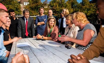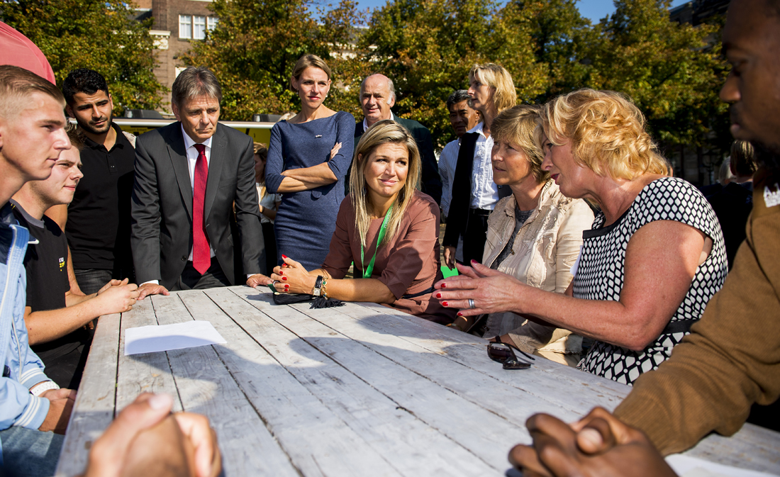 Tijdens de Werkweek tegen jeugdwerkloosheid, in september, vinden in het hele land meer dan honderd activiteiten plaats om de positie van jongeren op de arbeidsmarkt te versterken. Gemeenten, bedrijven, scholen, jongerenorganisaties en anderen laten die week zien wat zij doen om de kansen voor jongeren op werk te vergroten. Hare Majesteit Koningin Máxima was 18 september in Den Haag aanwezig bij een van de startevenementen van de Werkweek. Samen met Mirjam Sterk, ambassadeur Aanpak Jeugdwerkloosheid, ging zij kijken bij een bijeenkomst van DeBroekriem, waar werkzoekende jongeren contact leggen met managers uit het bedrijfsleven. De Koningin schoof aan bij netwerkgesprekken tussen jongeren en directeuren en personeelsmensen van bedrijven. DeBroekriem startte in 2012 en helpt jongeren hun netwerk en sollicitatievaardigheden te vergroten. Inmiddels is DeBroekriem uitgebreid naar twintig regio’s. In augustus 2014 vond de duizendste deelnemer een baan. Pieter Vermeer is een van de oprichters: “Ik was werkloos en zat thuis. En een aantal vrienden van mij ook. Toen belde ik mijn vrienden en ik zei: ‘jongens, we gaan afspreken. We gaan elkaar helpen.’ Langzaam is dat een netwerk geworden dat elkaar helpt.”