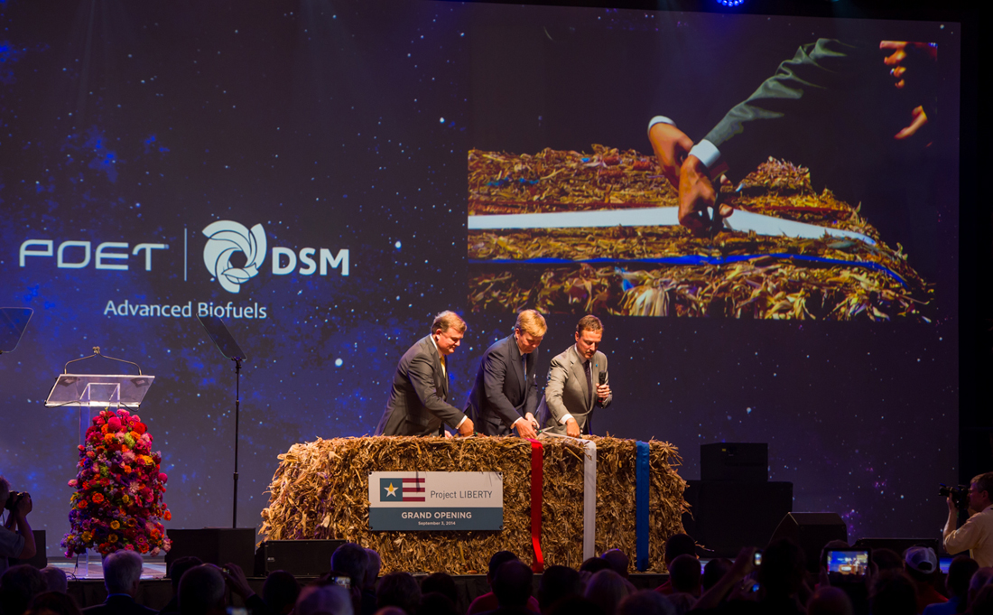 DSM leverde de biotechnologische kennis voor de omzetting van cellulose in de fabriek ‘Project Liberty’. De Amerikaanse partner POET brengt specialistische regionale ervaring in. De CEO van DSM, Feike Sijbesma, sprak van een historisch moment. “Vandaag gaan we een nieuw tijdperk tegemoet. Wij zijn de pioniers. De olie is misschien nog niet op, maar het stenen tijdperk eindigde ook niet omdat de stenen op waren. Er kwamen betere alternatieven beschikbaar. Dat gebeurt nu ook. Wij brengen goedkopere benzine aan de pomp, beschermen het milieu en zorgen ervoor dat we minder afhankelijk worden van buitenlandse olie.”