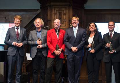 Zijne Majesteit Koning Willem-Alexander was op 9 september aanwezig bij de toekenning van de Spinozapremies 2014 in de Nieuwe Kerk in Den Haag aan experimenteel natuurkundige Dirk Bouwmeester, archeoloog Corinne Hofman, milieutechnoloog Mark van Loosdrecht en trekvogelecoloog Theunis Piersma.