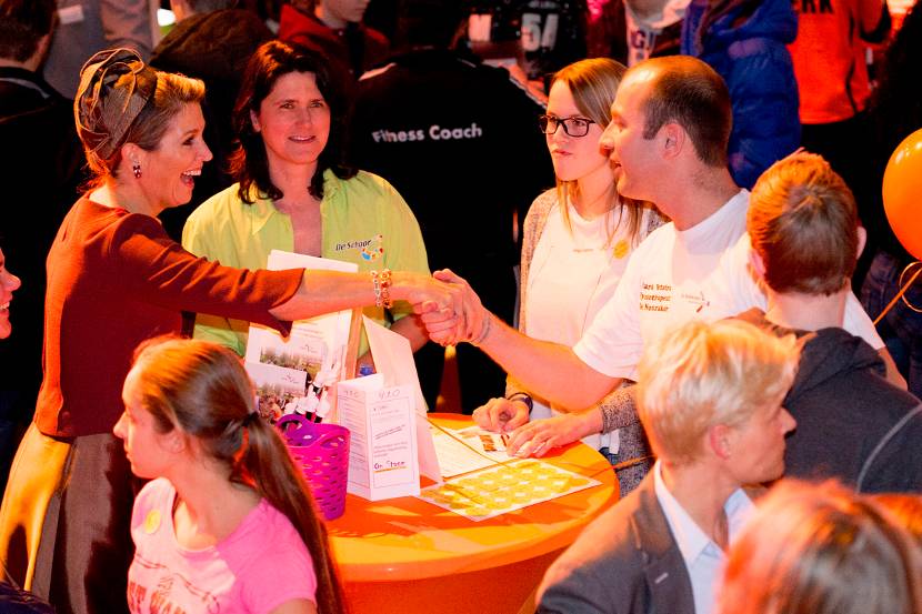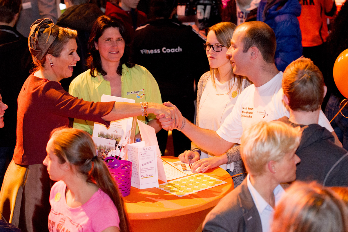 Koningin Máxima praatte tijdens het evenement met leerlingen en beroepsbeoefenaren. Onder hen Ouassima El Mounhime (13) en Naomi Telgt (13) van het Buitenhoutcollege. Ouassima: “De Koningin was heel aardig. Ze vroeg wat ik wilde worden en toen zei ik kinderarts. Dat vond zij heel leuk.” Naomi: “Ik vertelde haar dat ik fysiotherapeut of psychiater wil worden. De Koningin vond dat wij goed bezig waren omdat we al twee matches hadden gemaakt.”