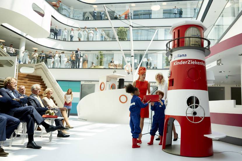 Een kleurrijk helikoptertje dat er uitziet als een vriendelijke bij. Een mini-vuurtoren. Gekleurd licht. Vrolijke projecties met bewegende animatiefiguren op de muren. Een ‘snoezelkamer’. Is dit een attractie voor kinderen? Nee: het zijn elementen van het nieuwe Juliana Kinderziekenhuis in Den Haag. Hare Majesteit Koningin Máxima opende het nieuwe complex op 12 juni. Zij deed dat door, samen met de jonge patiënten Bram en Joeley, de laatste steen in de vuurtoren te plaatsen.