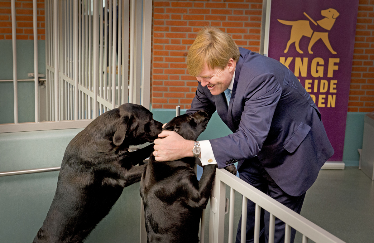 De Koning liet zich uitgebreid informeren over geschiedenis, heden en toekomst van KNGF Geleidehonden. Daarnaast genoot hij van de kennismaking met de honden zelf. Hij stak zijn enthousiasme niet onder stoelen of banken: “Ik neem je gewoon mee. Ik neem jullie allemaal mee.”