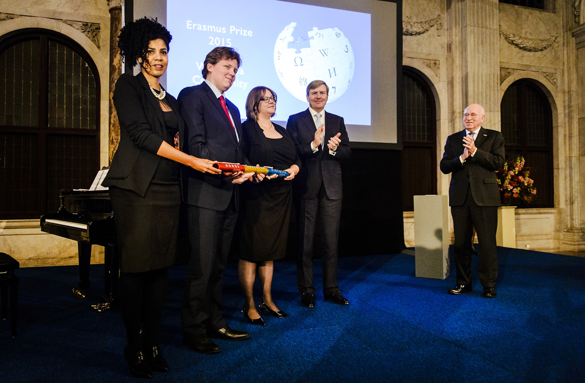 Wikipedia heeft sinds 2001 de wereld van kennis opgeschud met een wereldwijde, digitale encyclopedie die beschikbaar is in 250 talen en die toegankelijk is voor iedereen. Tienduizenden vrijwilligers dragen als redacteur of auteur aan de encyclopedie bij. Deze Wikipedia-gemeenschap werd op 25 november geëerd met de Erasmusprijs 2015. Zijne Majesteit Koning Willem-Alexander reikte de prijs uit aan drie actieve Wikipedianen die symbool staan voor de grote betekenis van Wikipedia voor kennisverspreiding, emancipatie en cultuur. Bestuurslid Bregtje van der Haak van de Stichting Praemium Erasmianum prees de onafhankelijkheid van Wikipedia. “Wikipedia is nu de enige not-for-profit website onder de top-tien van meest bezochte websites. Hoewel velen het hebben geprobeerd, kan een gunstiggezind lemma in Wikipedia niet gekocht worden.”